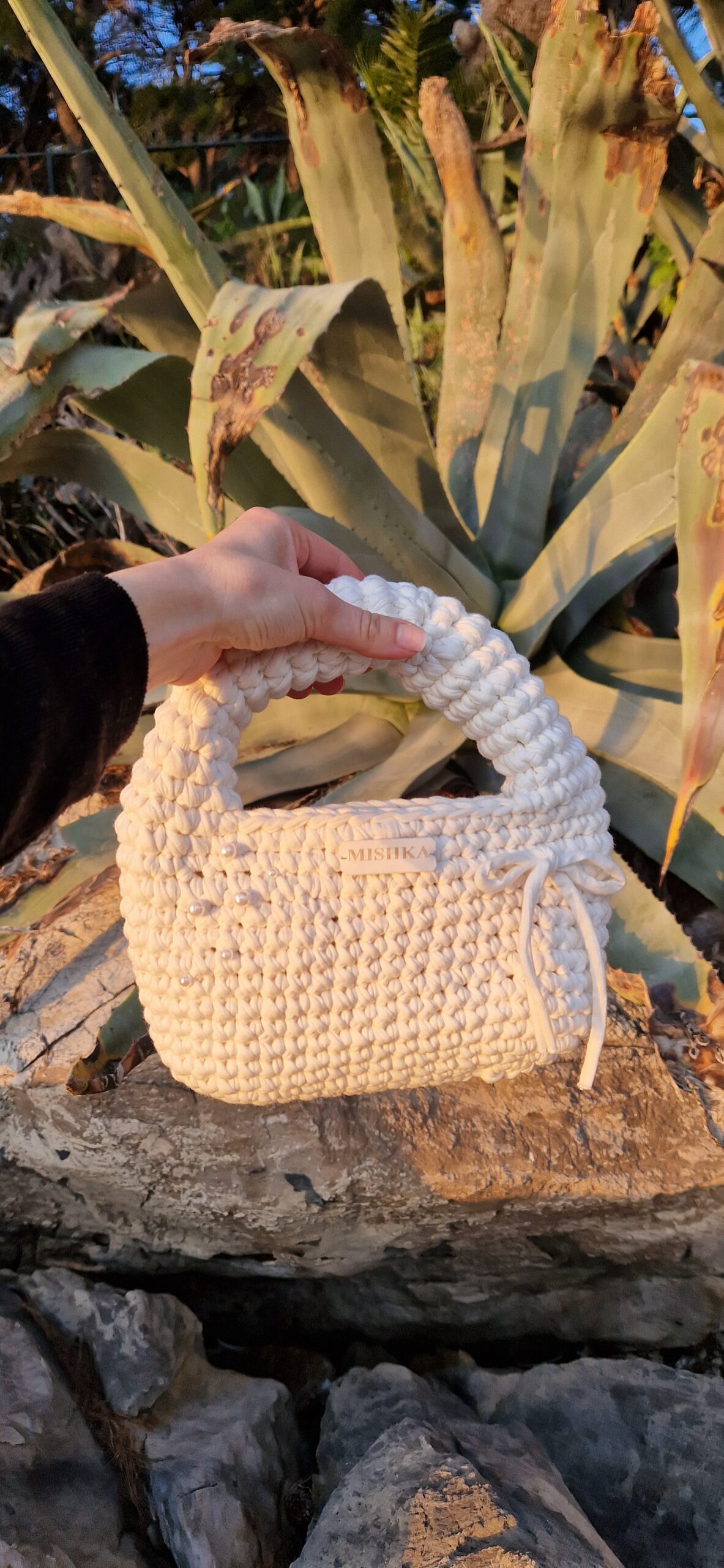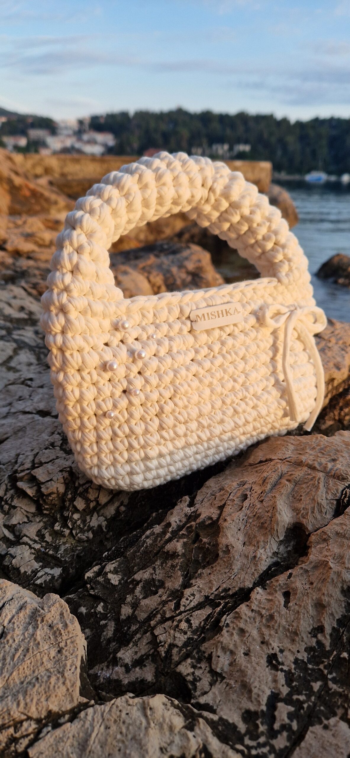 Ručno izrađena torba od t-shirt yarna (trakaste pamučne pređe) u bijeloj boji. Ukrašena je mašnicama i bijelim biserima koji joj daju poseban izgled. Torba je praktična i izdržljiva.