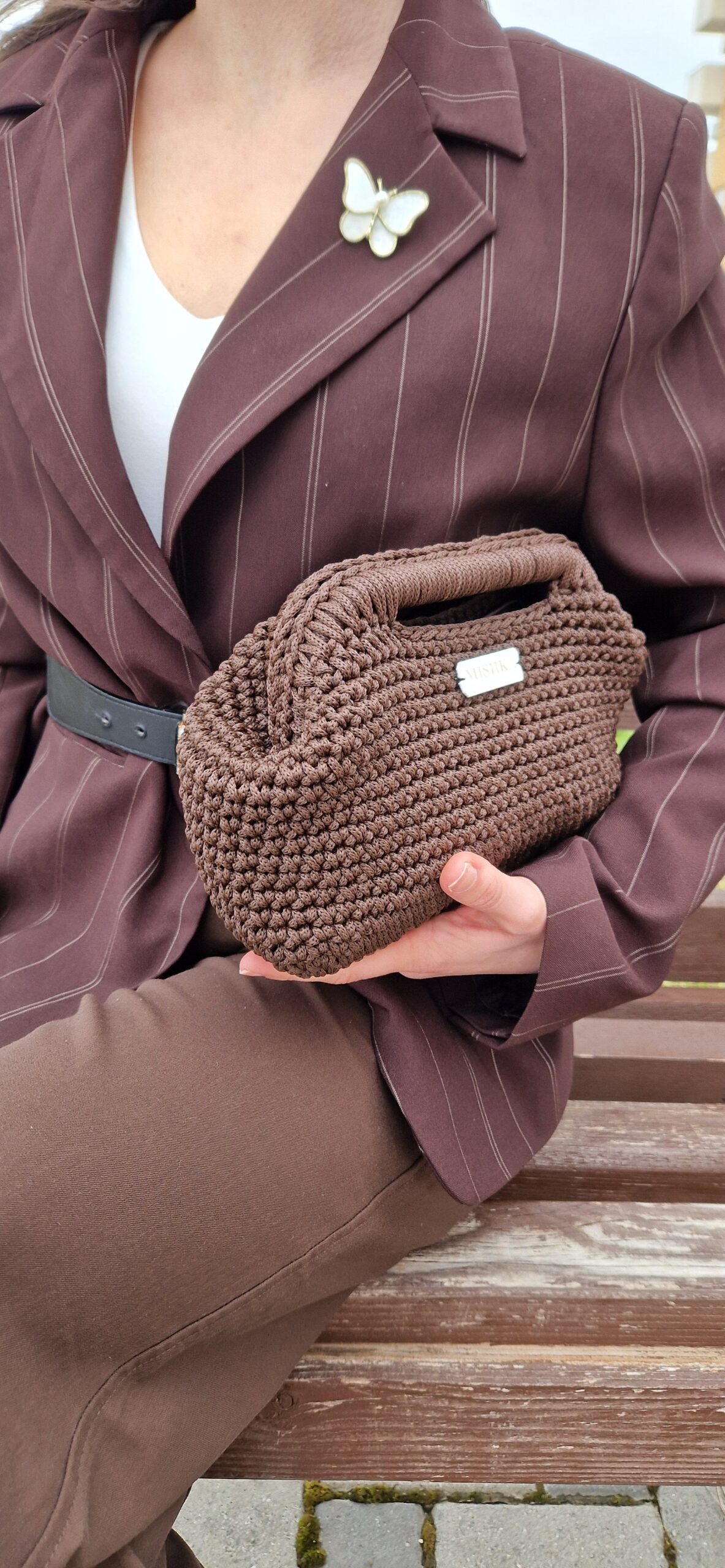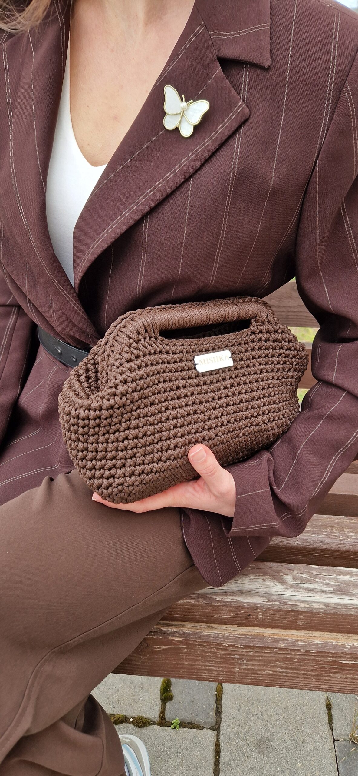 Ručno izrađena clutch torba Cassia u tamno smeđoj boji, izrađena od macramé konca. Minimalistički dizajn i prirodna tekstura čine je praktičnom, izdržljivom i elegantnom za svakodnevnu upotrebu.