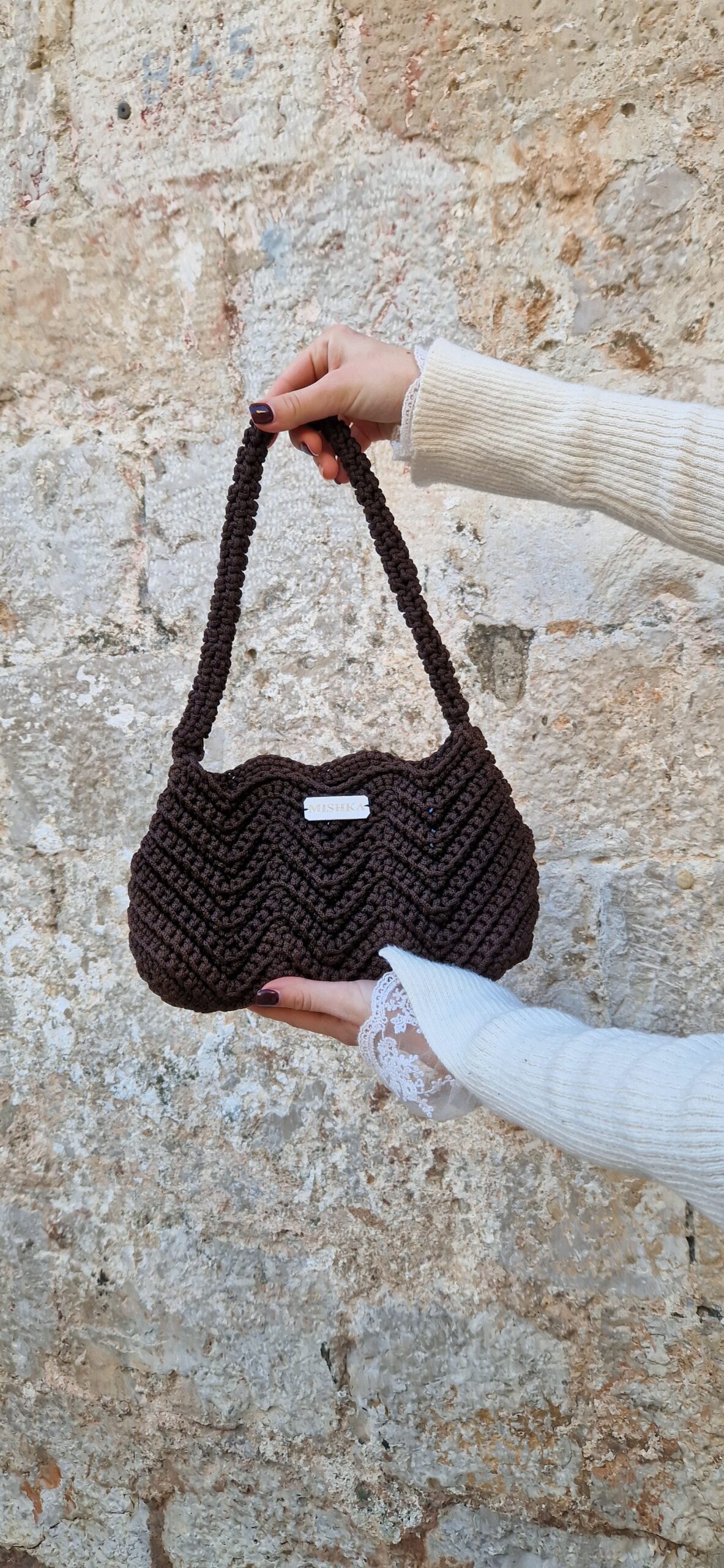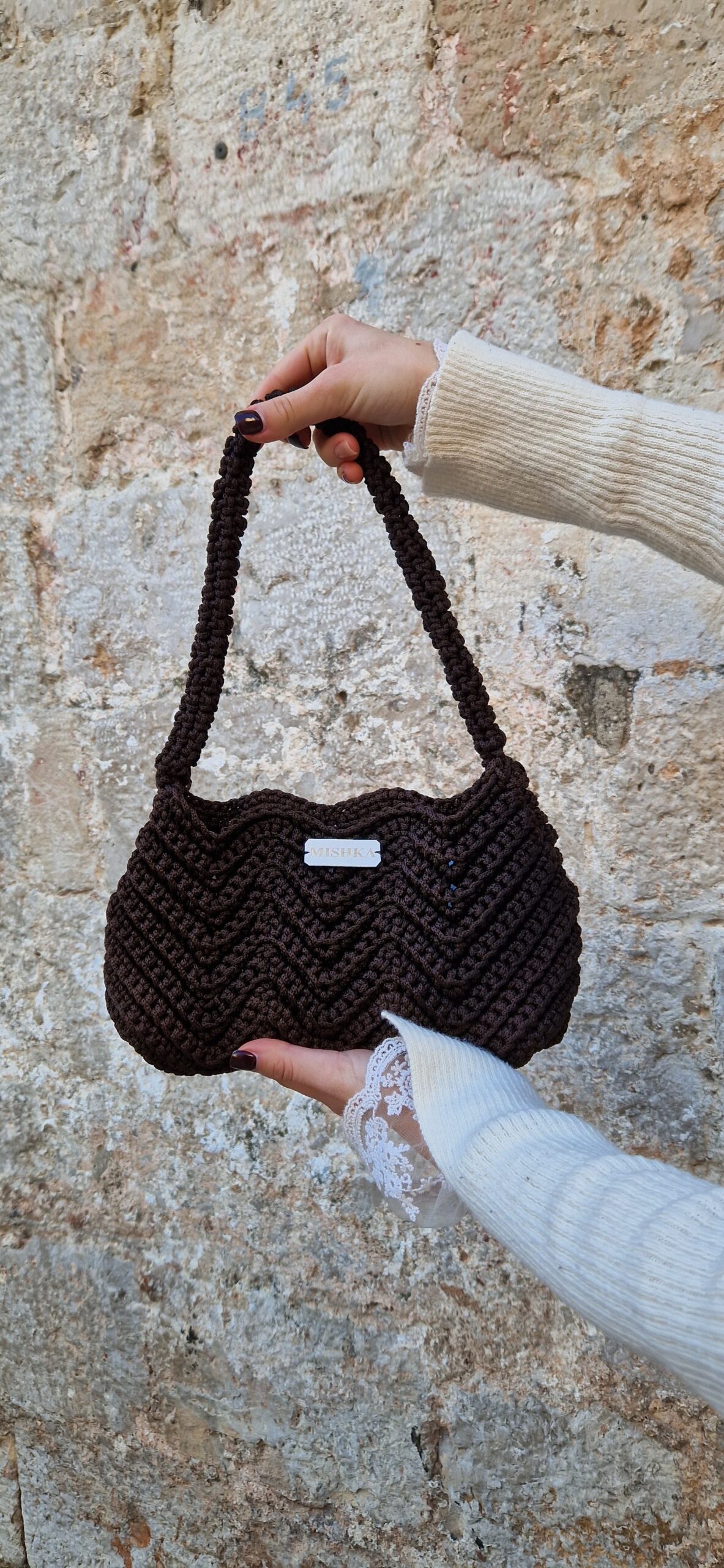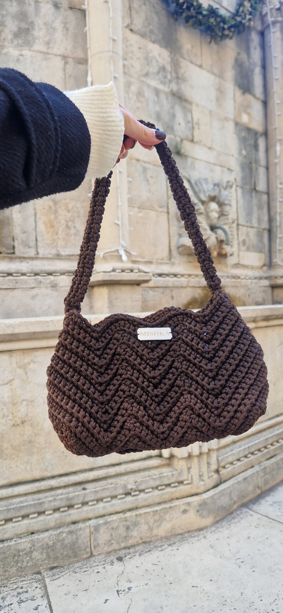 Ručno pletena tamnosmeđa torba.