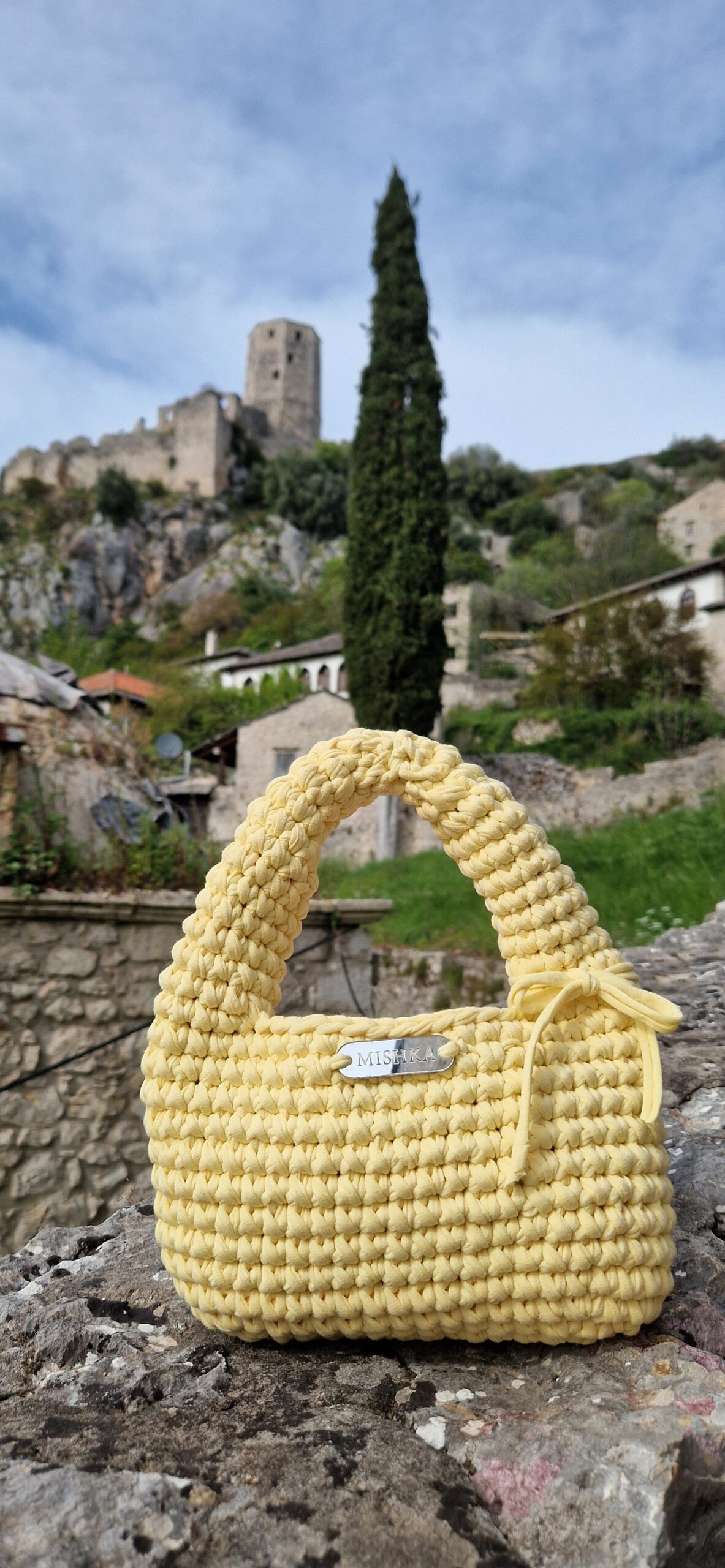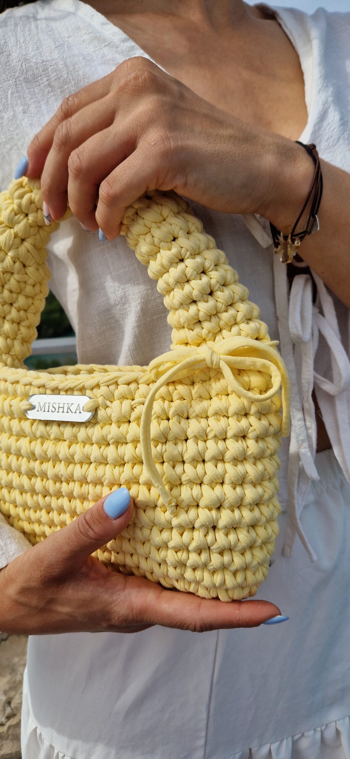 Torbica od 100% pamučne trake. Srebrena Mishka pločica. Torbica koja je lagana a dovoljno čvrsta te zadržava oblik.