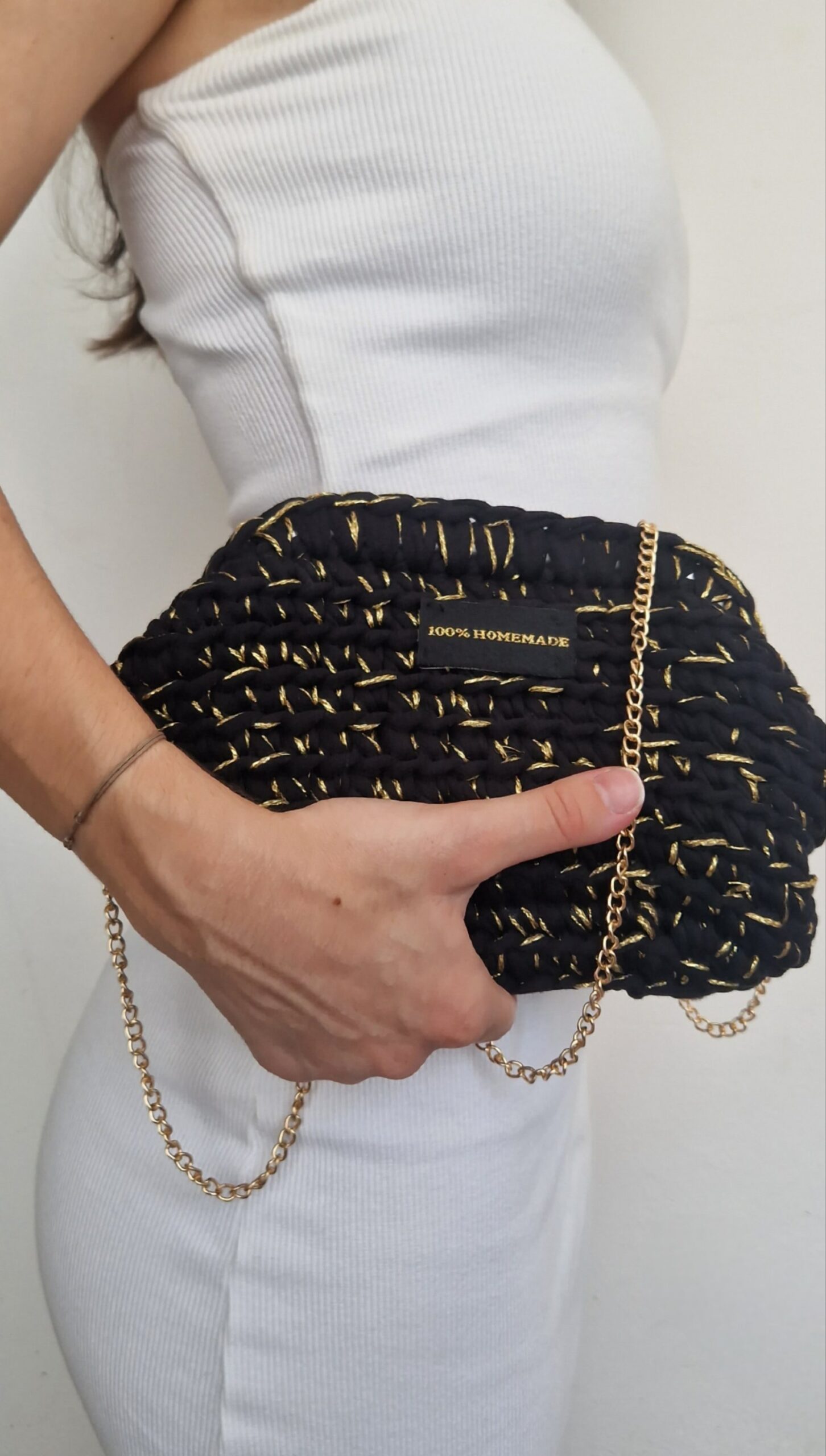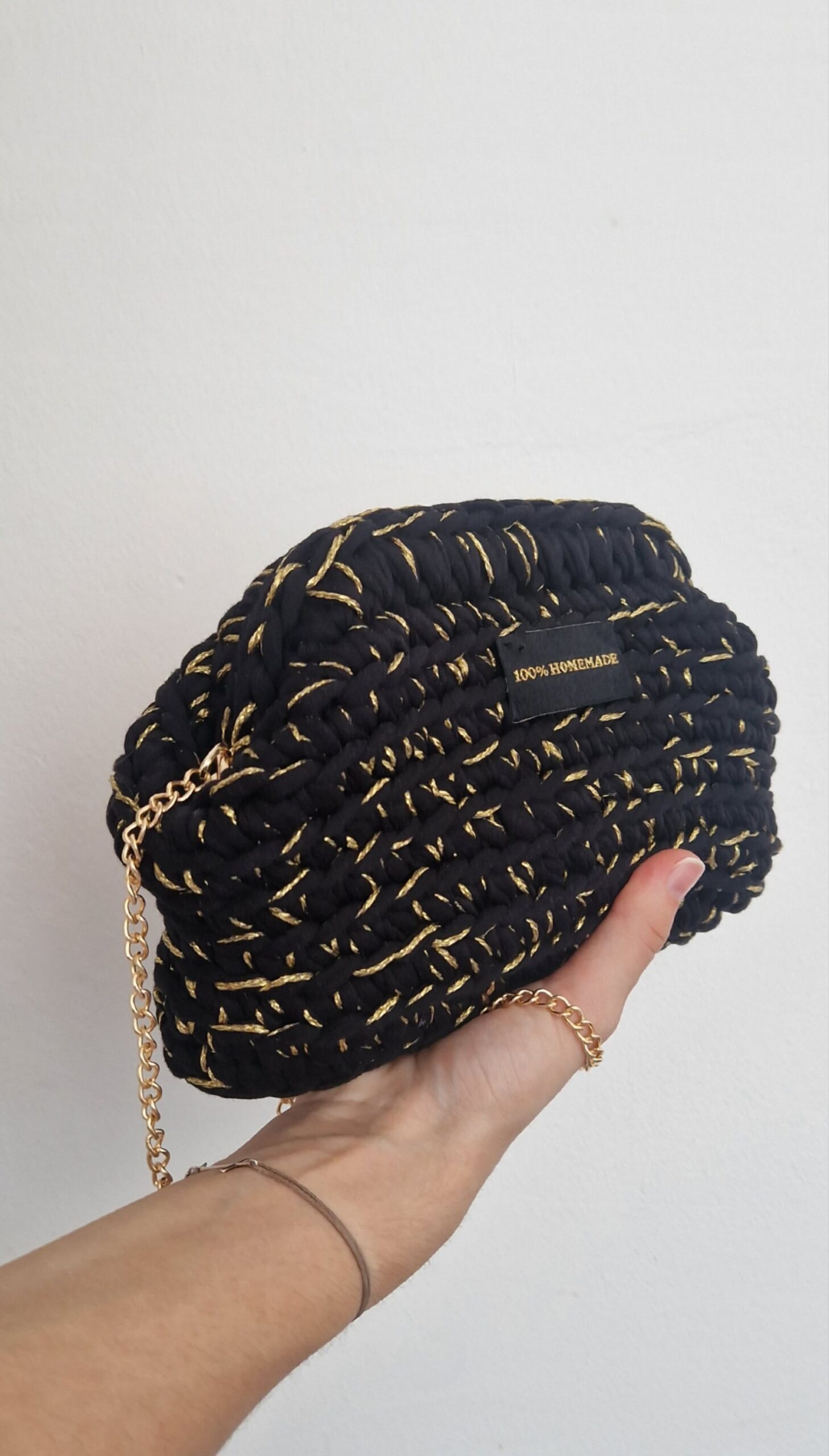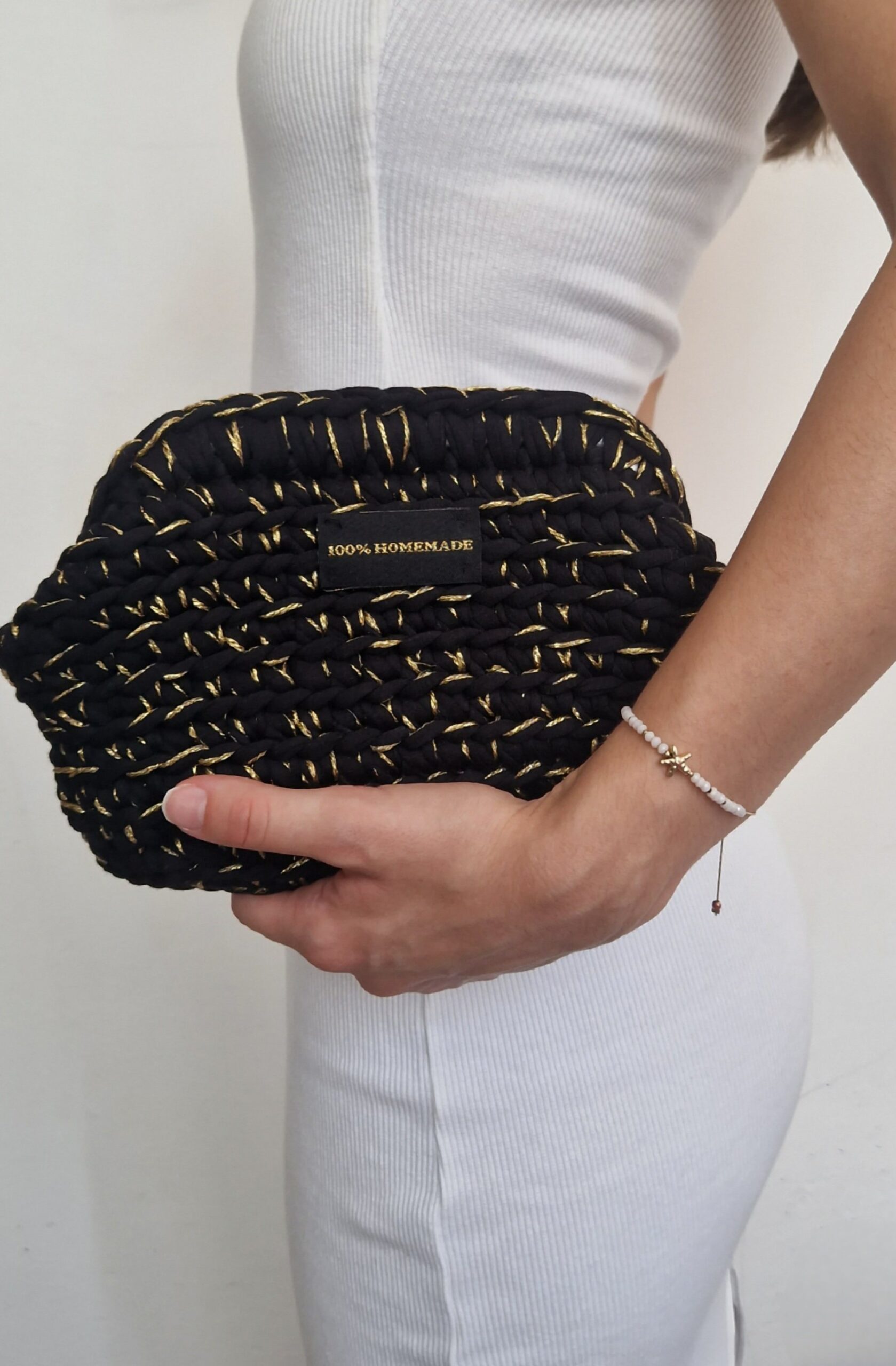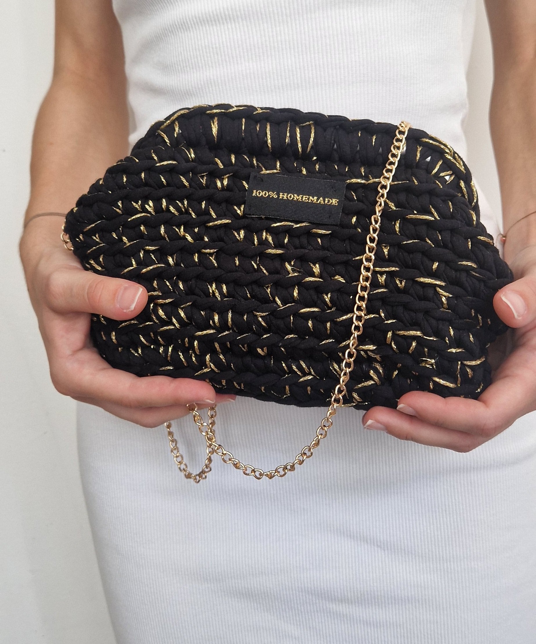 Elegantni clutch ručno izrađen od visokokvalitetnog T-shirt yarna, oplemenjen tankim zlatnim koncem koji stvara suptilan efekt prošiva. Kombinacija crne osnove i diskretnog zlatnog detalja daje torbici sofisticiran i luksuzan izgled.