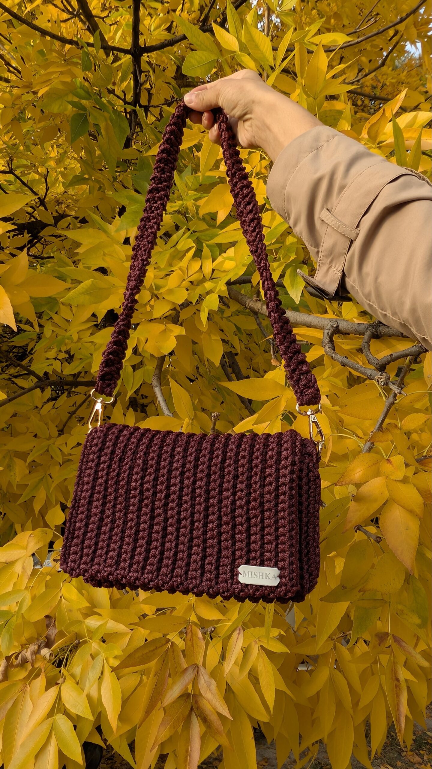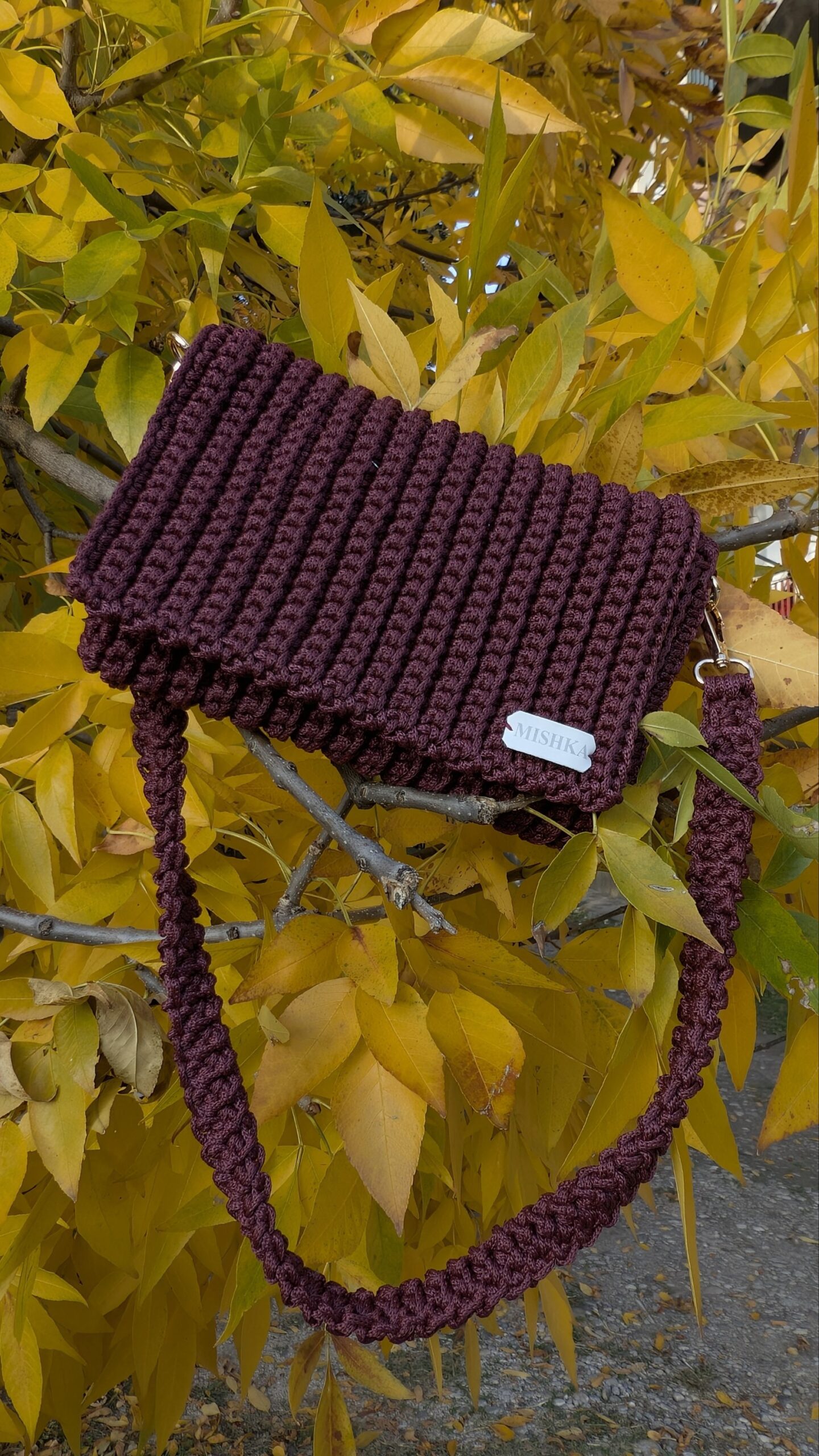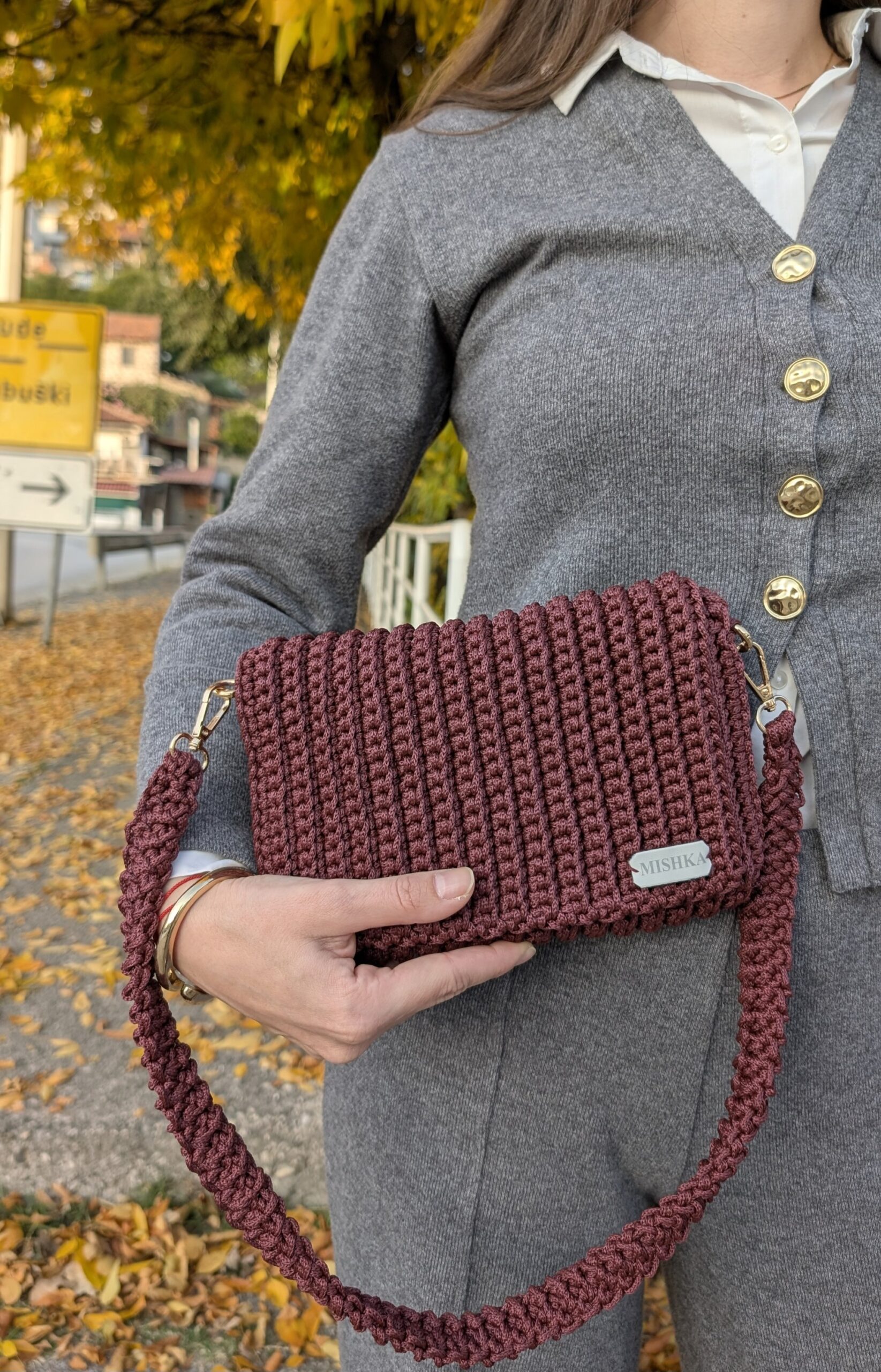 Torbica ručno rađena od makrame konca u bordo boji. Kompaktna, čvrsta i elegantna, idealna za svakodnevno nošenje ili posebne prilike. Dolazi s odvojivim remenom izrađenim u istom stilu, te metalnim detaljima u zlatnoj boji.