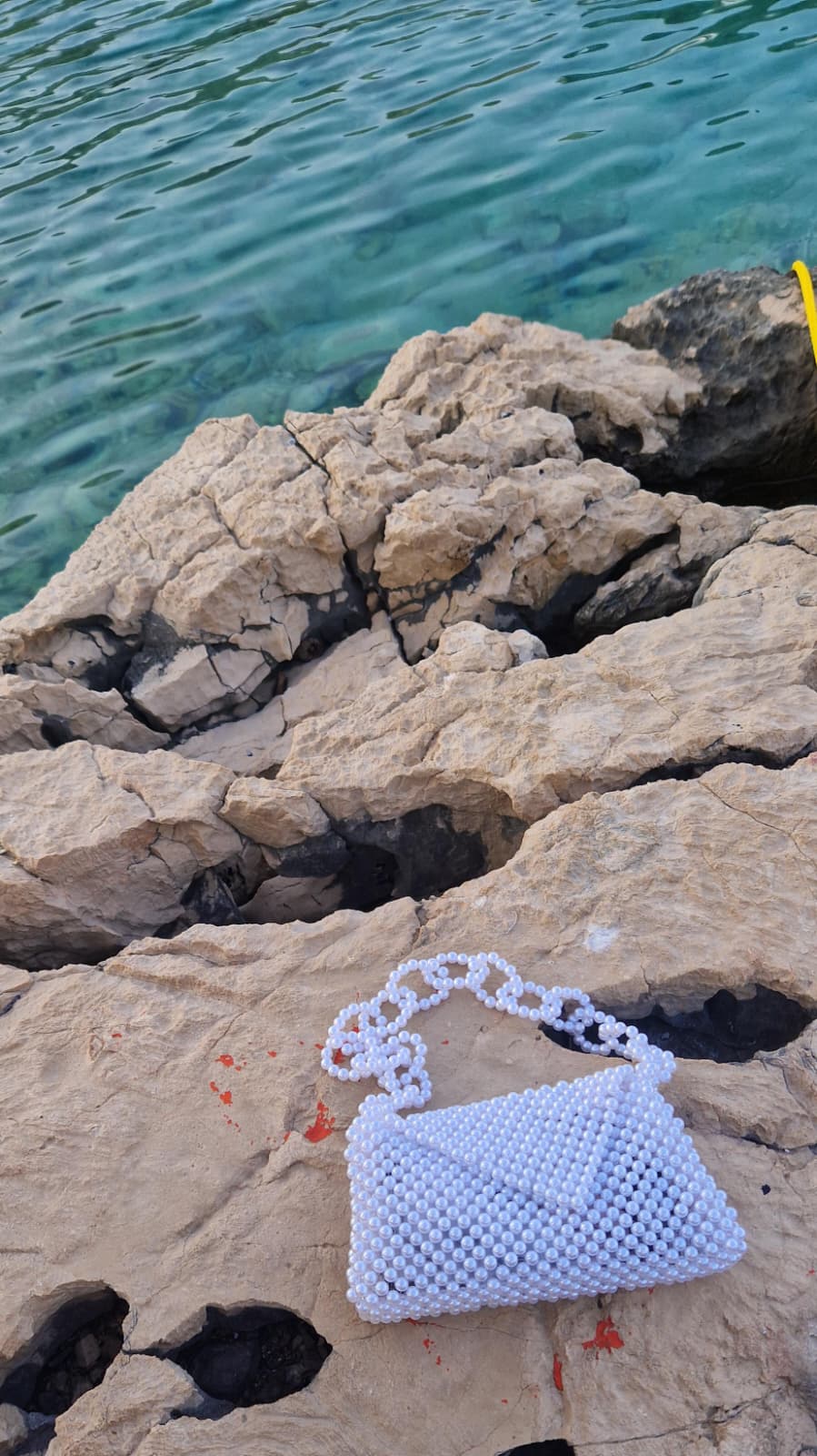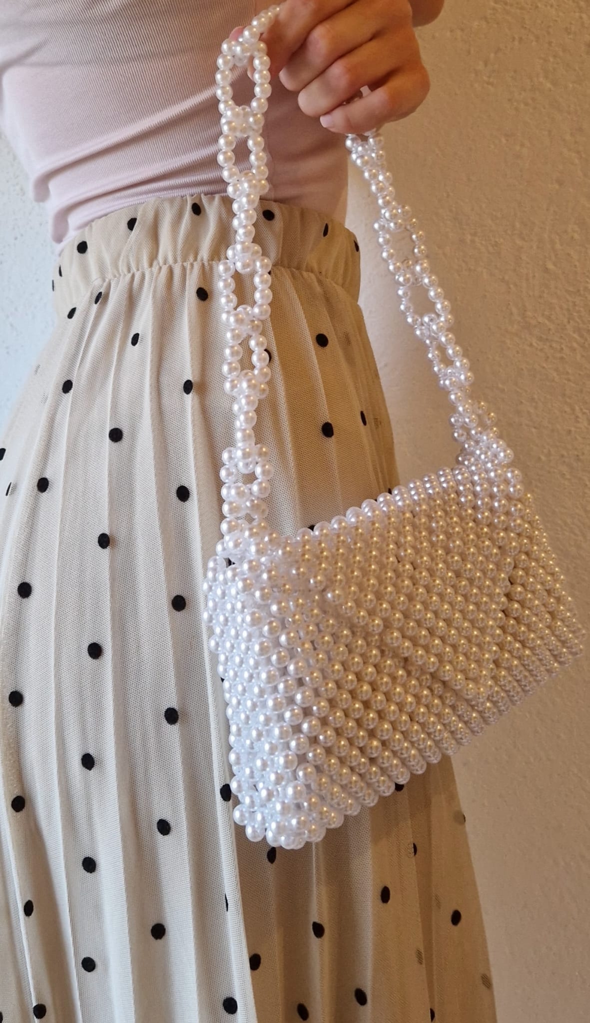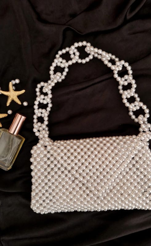 Elegantna torbica ukrašena bisernim perlama i art ručkom u lancu. Idealna za vjenčanja, maturalne i večernje izlaske. Dovoljno prostora za telefon, ruž i ključeve.
