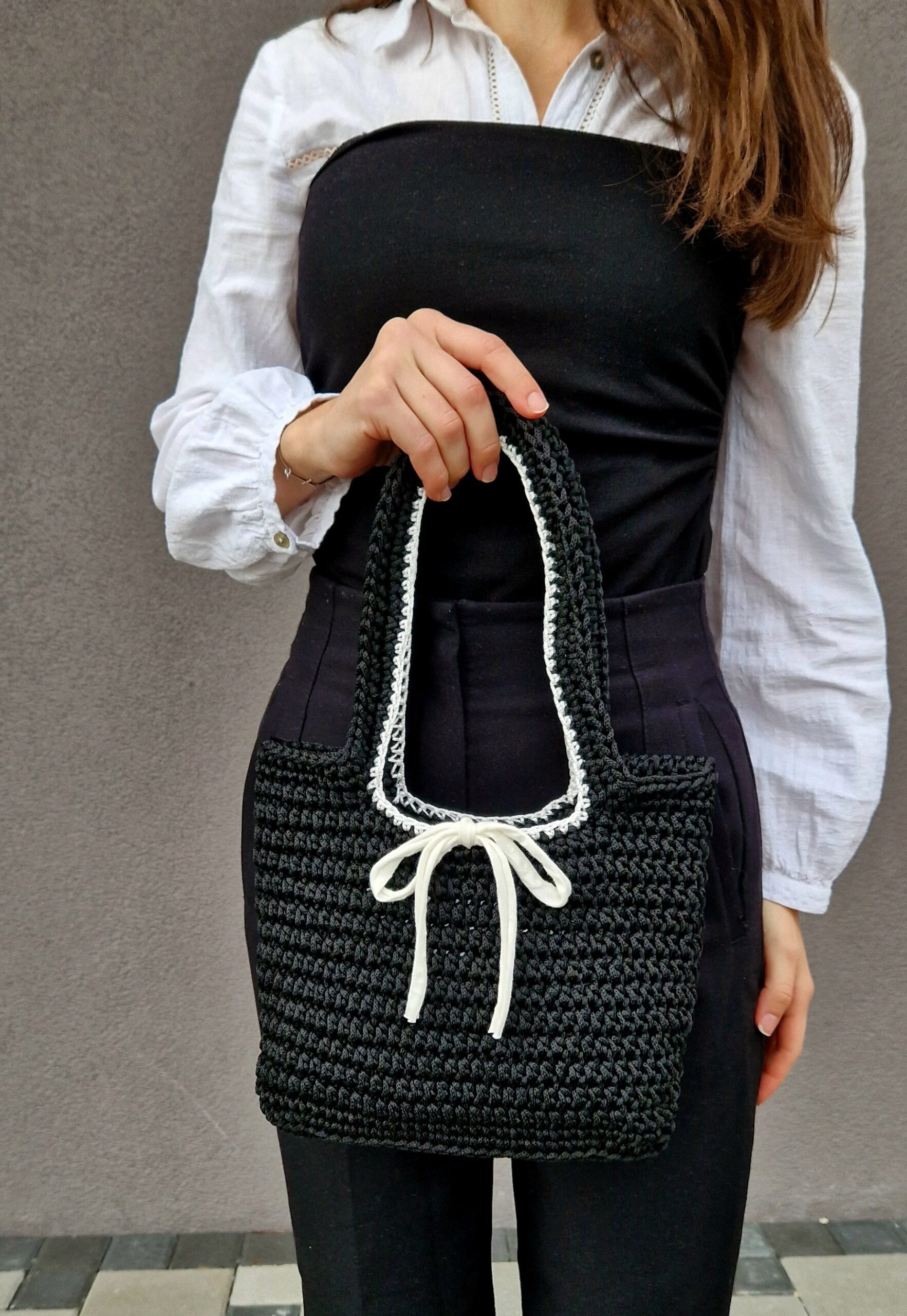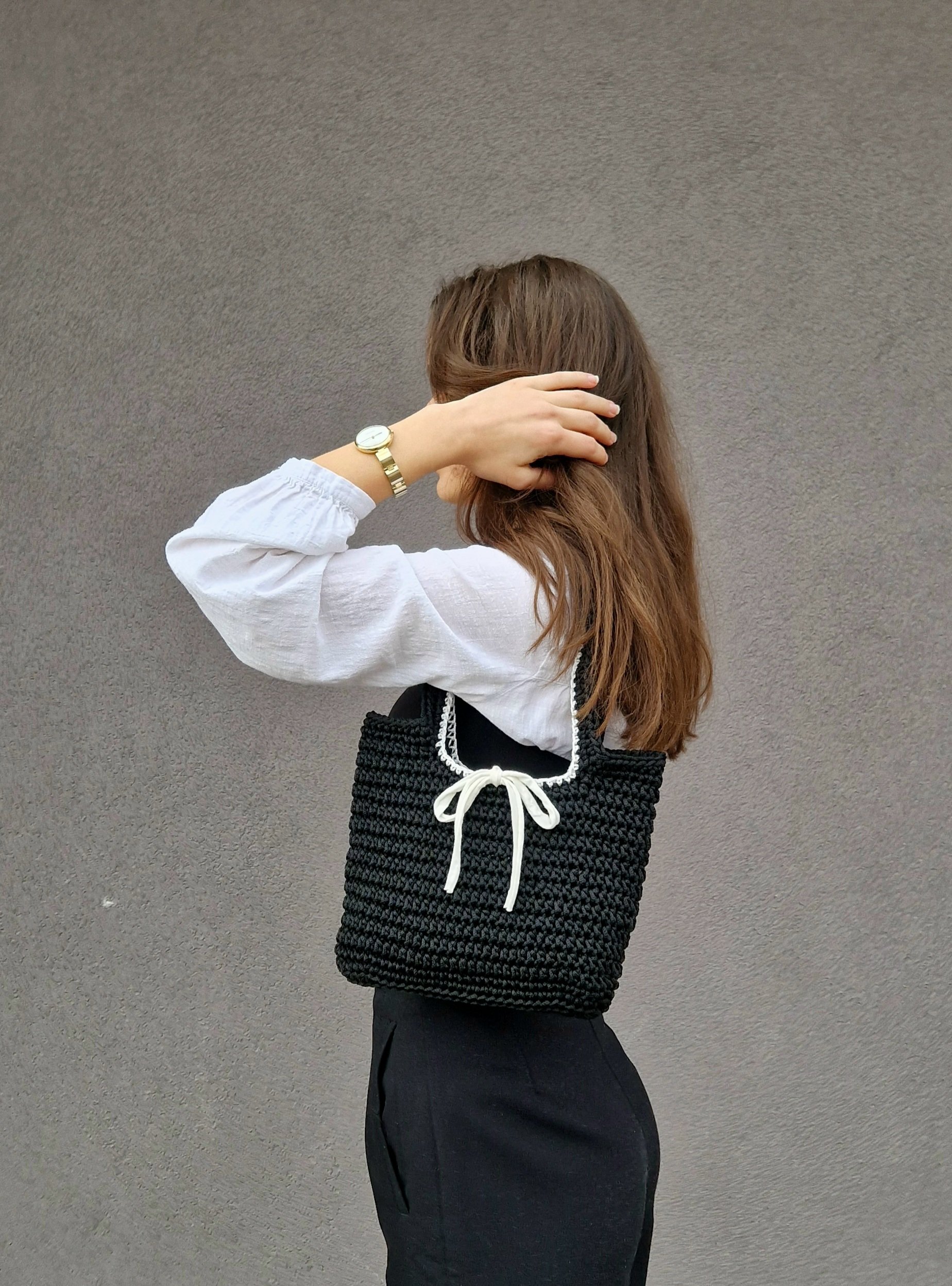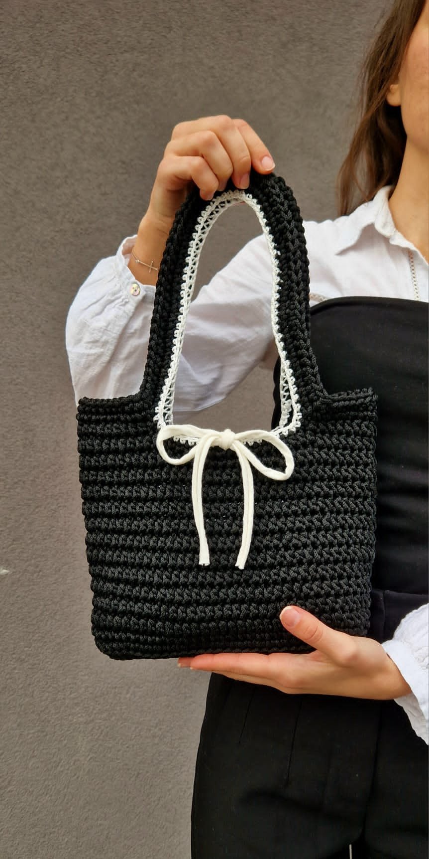Elegantna, ručno rađena torbica koja spaja jednostavnost i profinjenost. Izrađena je od čvrstog pletiva u klasičnoj crnoj boji, s bijelim detaljima. Ručke su ojačane, a mašna kao detalj naglašava nježan, ženstven izgled.