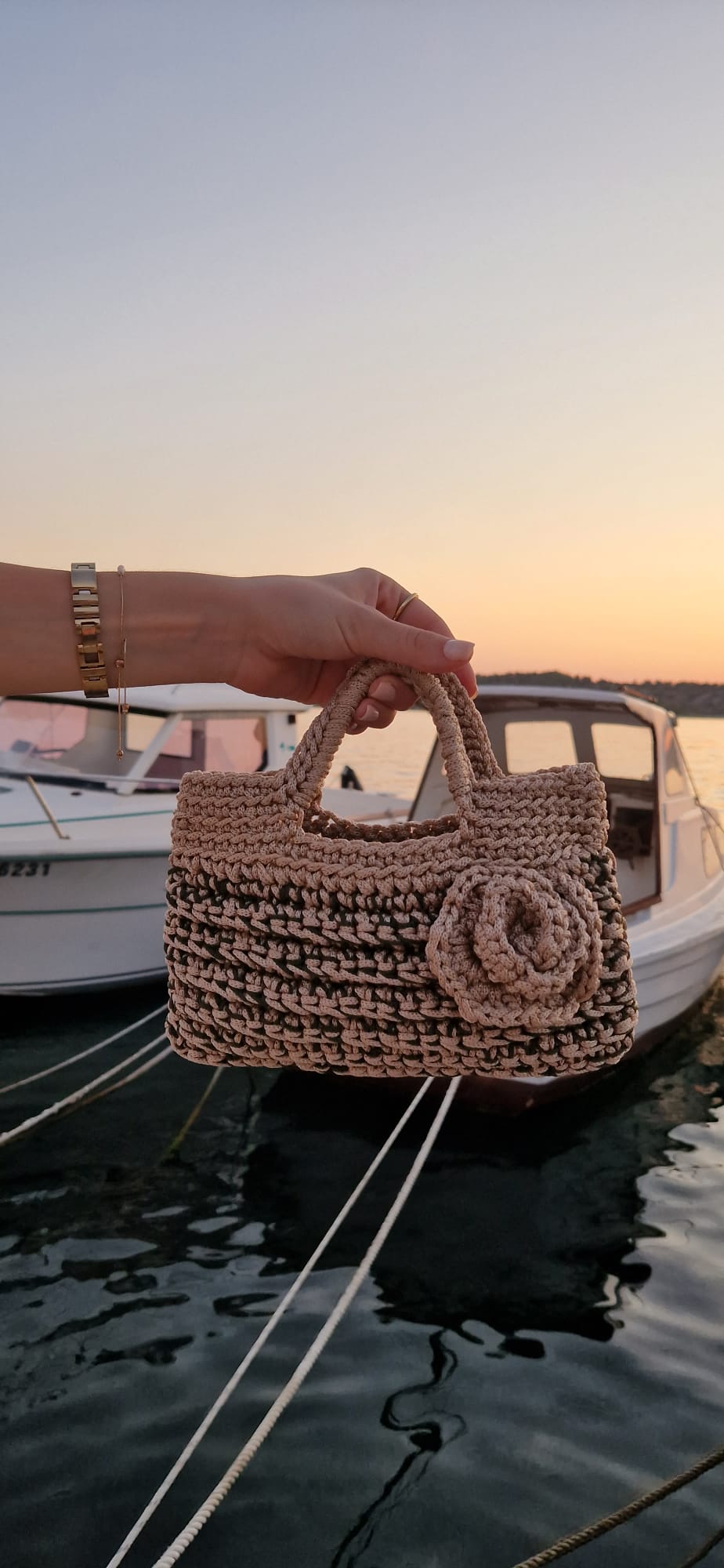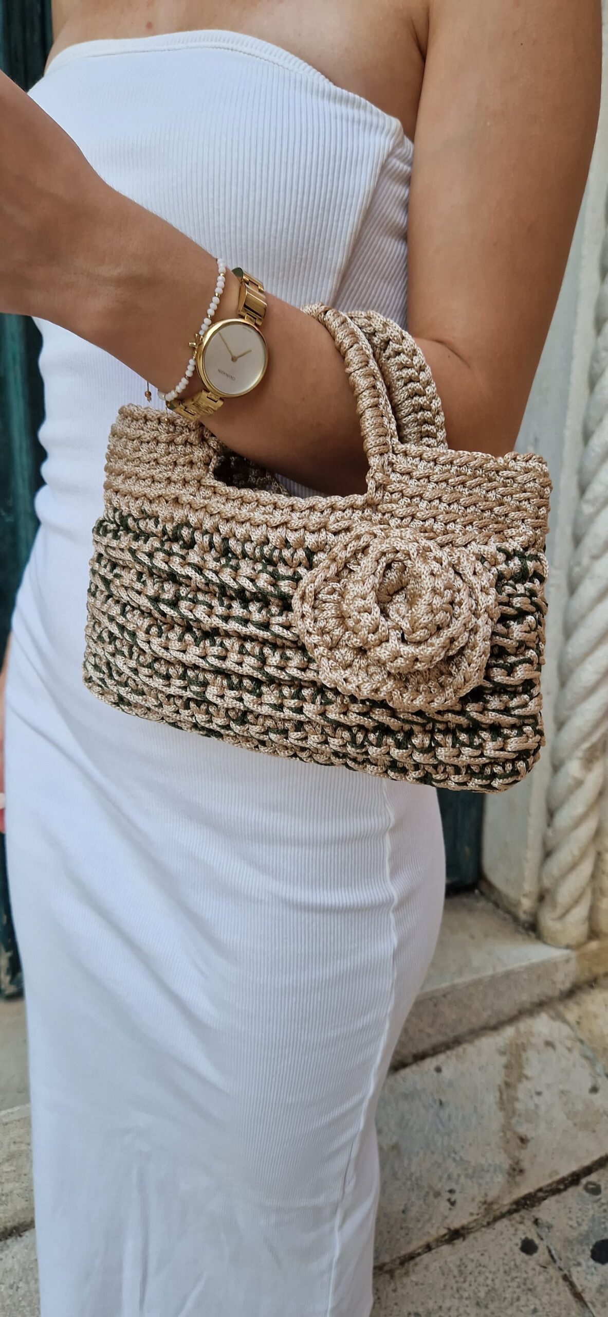 Ljetna pletena torbica od sjajnog konopa u bež tonu s maslinastim detaljima i dekorativnim pletenim cvijetom. Udobne kratke ručke, lagana i čvrsta – idealna za kavu u gradu, šetnju i putovanja. Stane telefon, novčanik, naočale i sitnice.