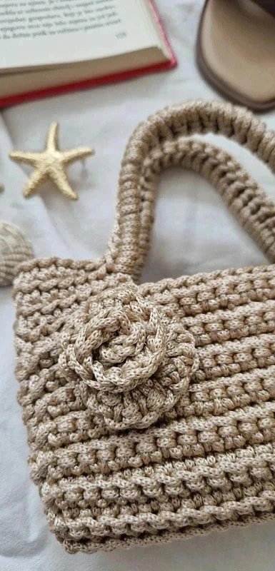 Ručno rađena, lagana i izdržljiva ljetna torbica od sjajnog pletenog konopa. Klasična bež boja, čvrste duple ručke i dekorativni pleteni cvijet.