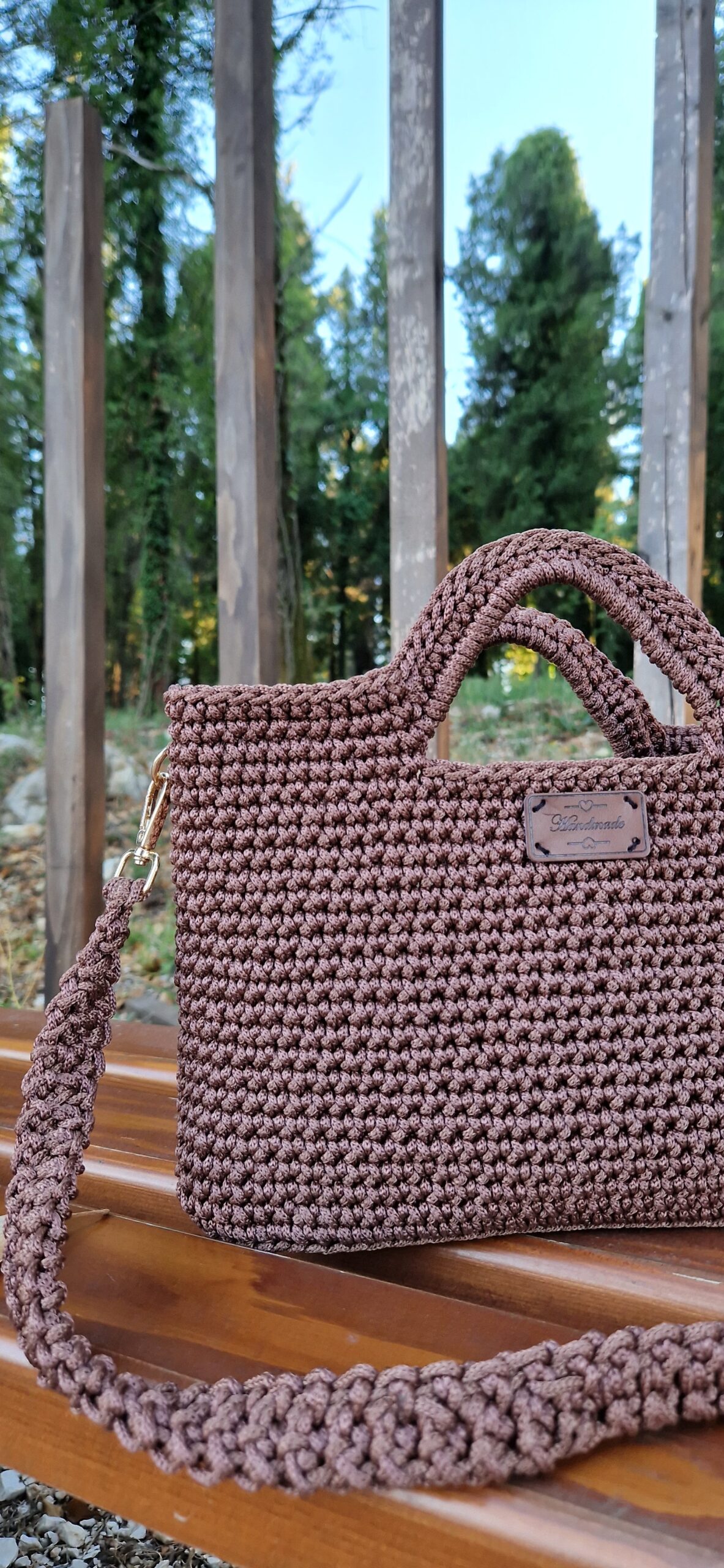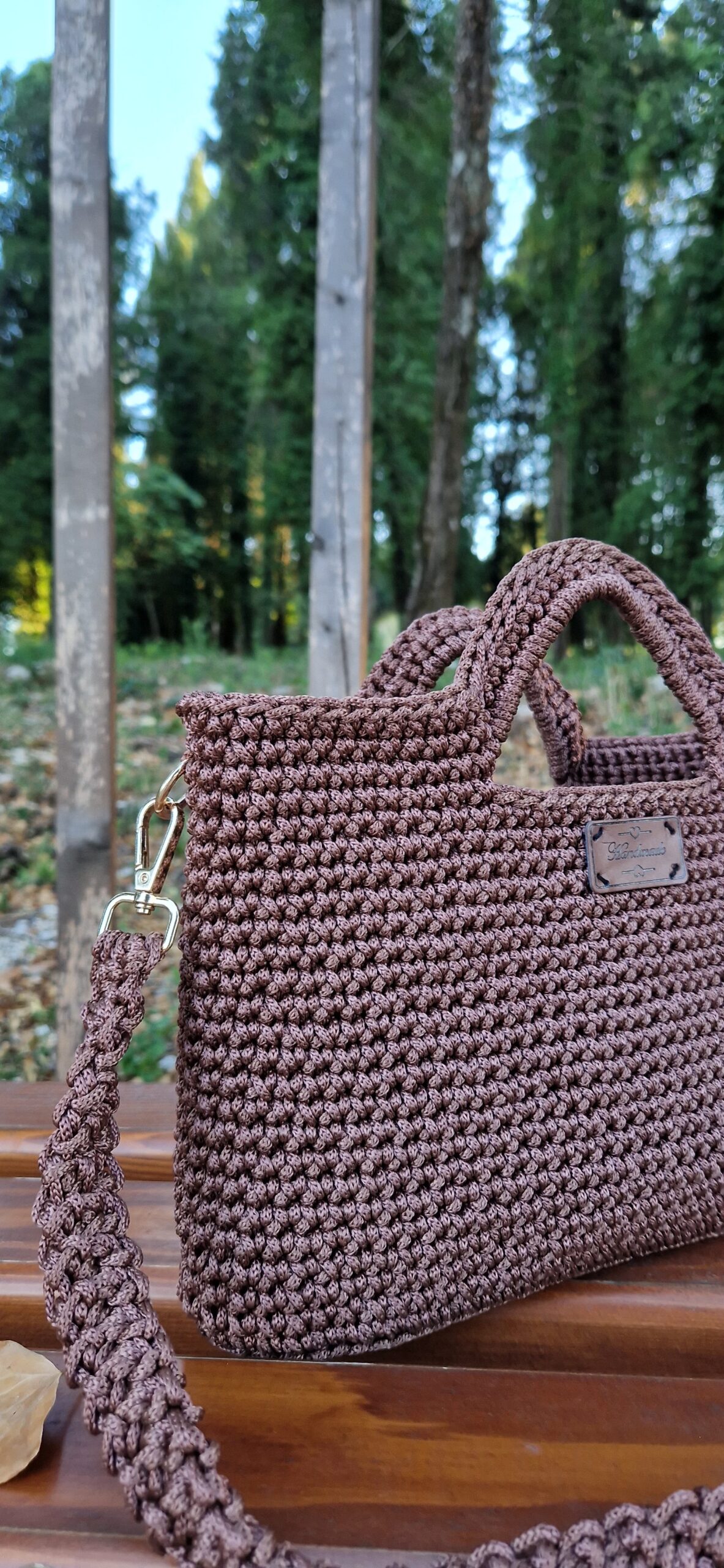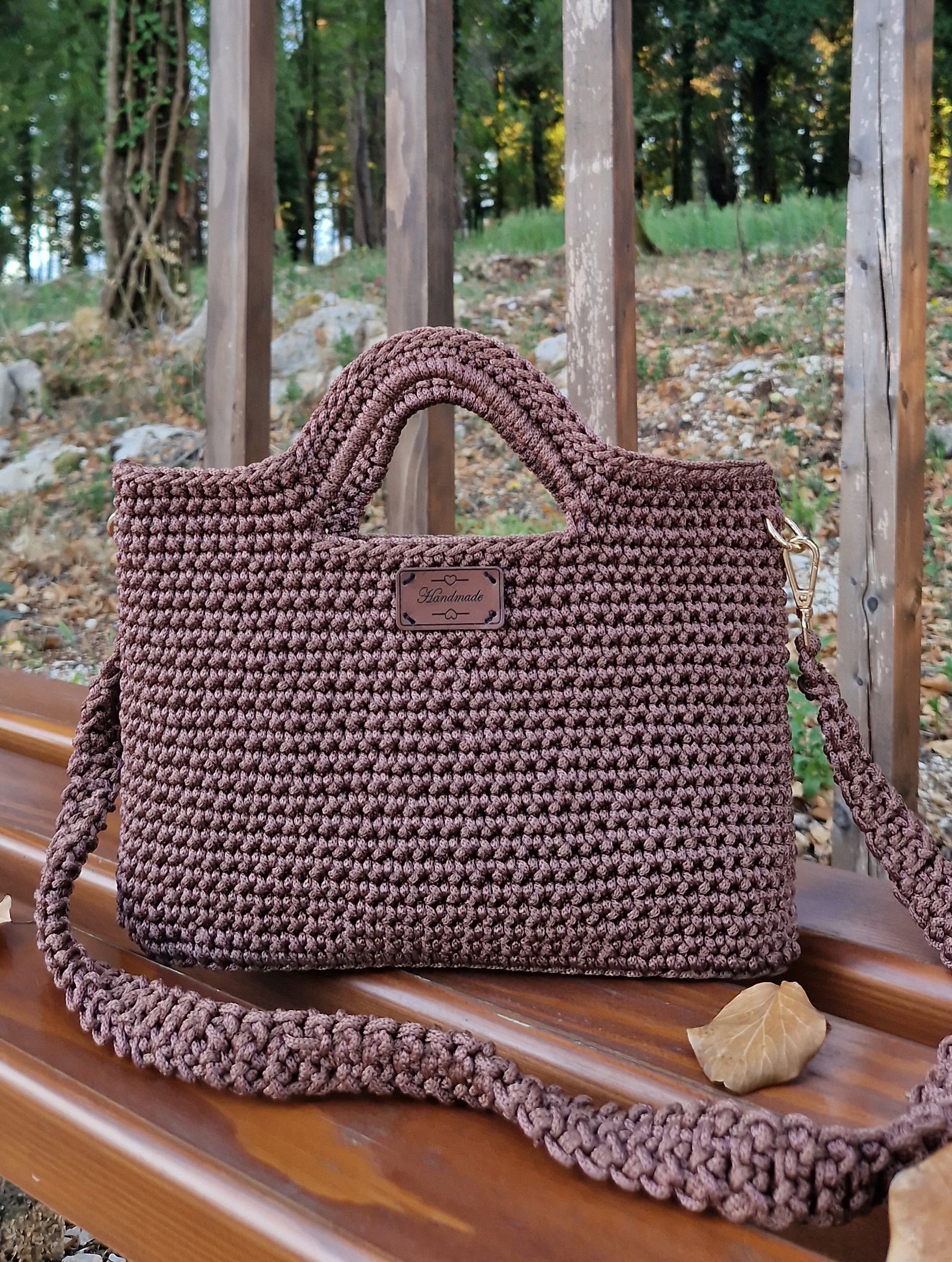 Kompaktna ručno pletena torbica u toploj smeđoj nijansi s dvostrukim ručkama. Lagana, čvrsta i savršena za šetnju rivom, kavu u gradu ili večernji izlazak. Stanu telefon, novčanik, naočale i sitnice.