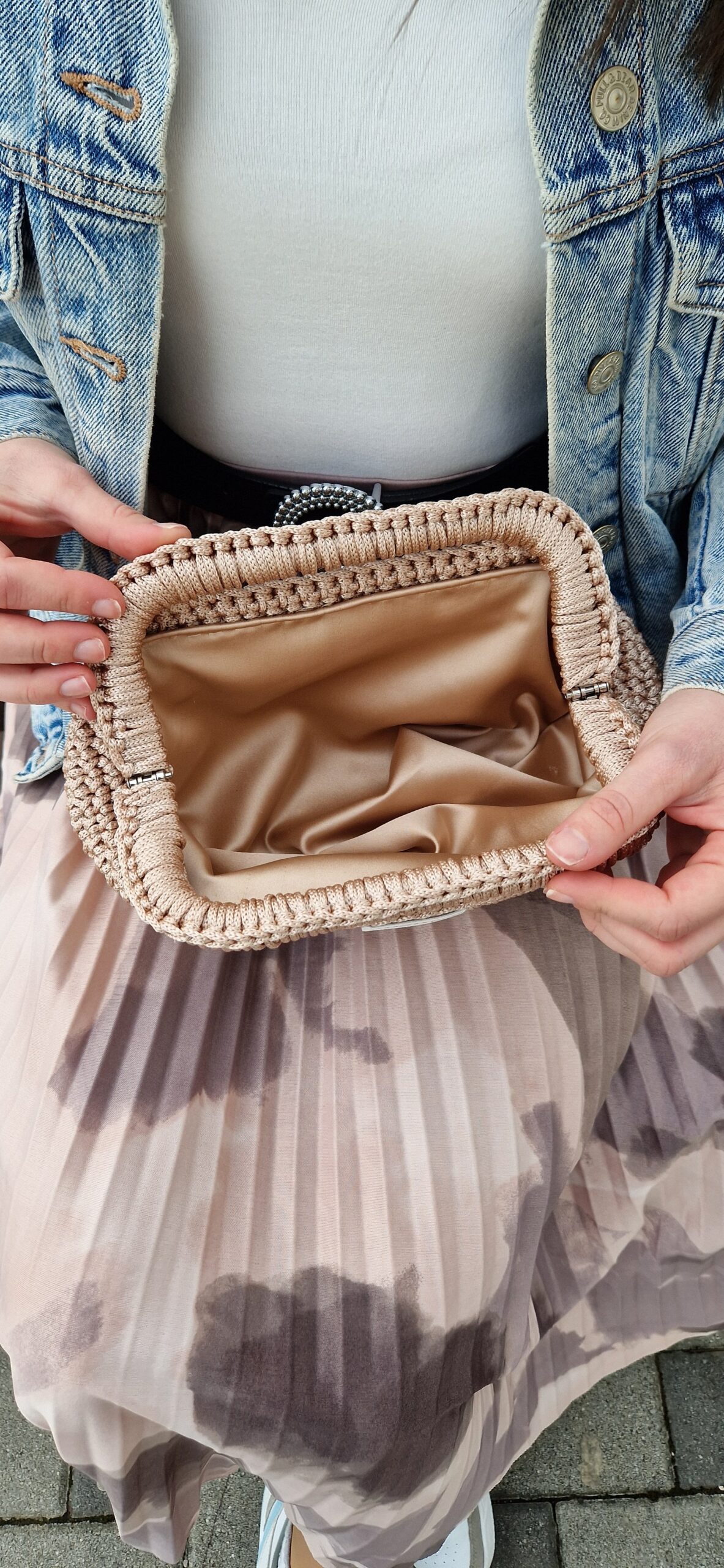 Torbica ima satensku podstavu koja pomaže da torba zadrži svoj oblik.