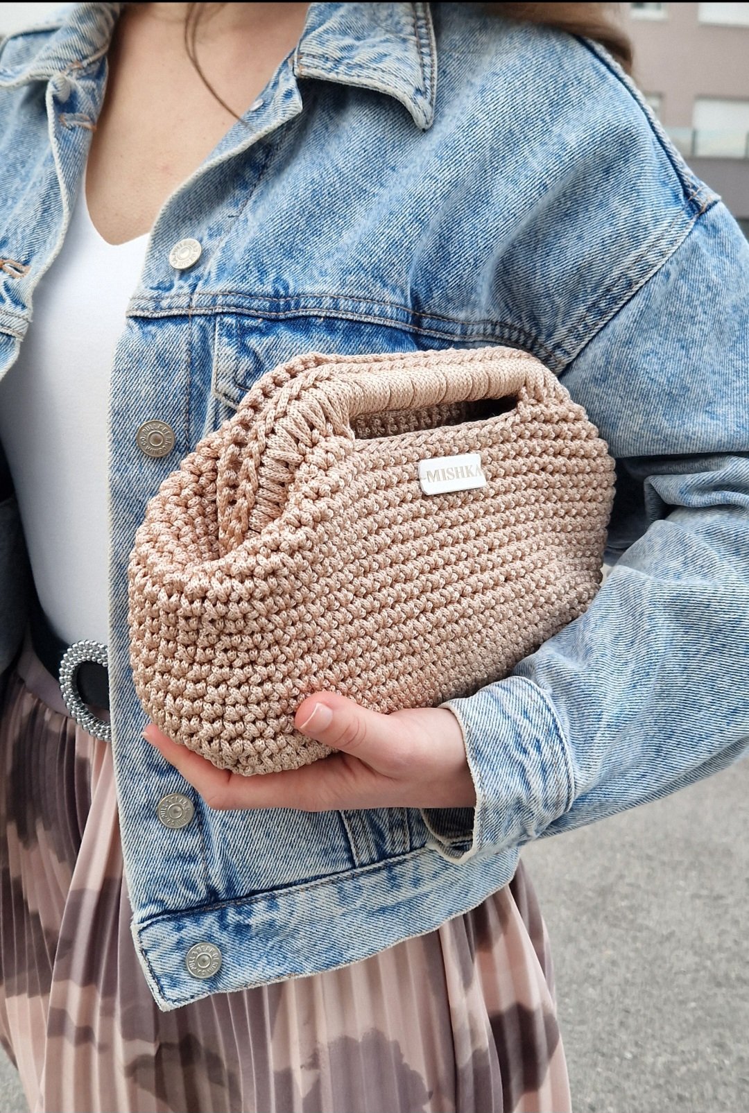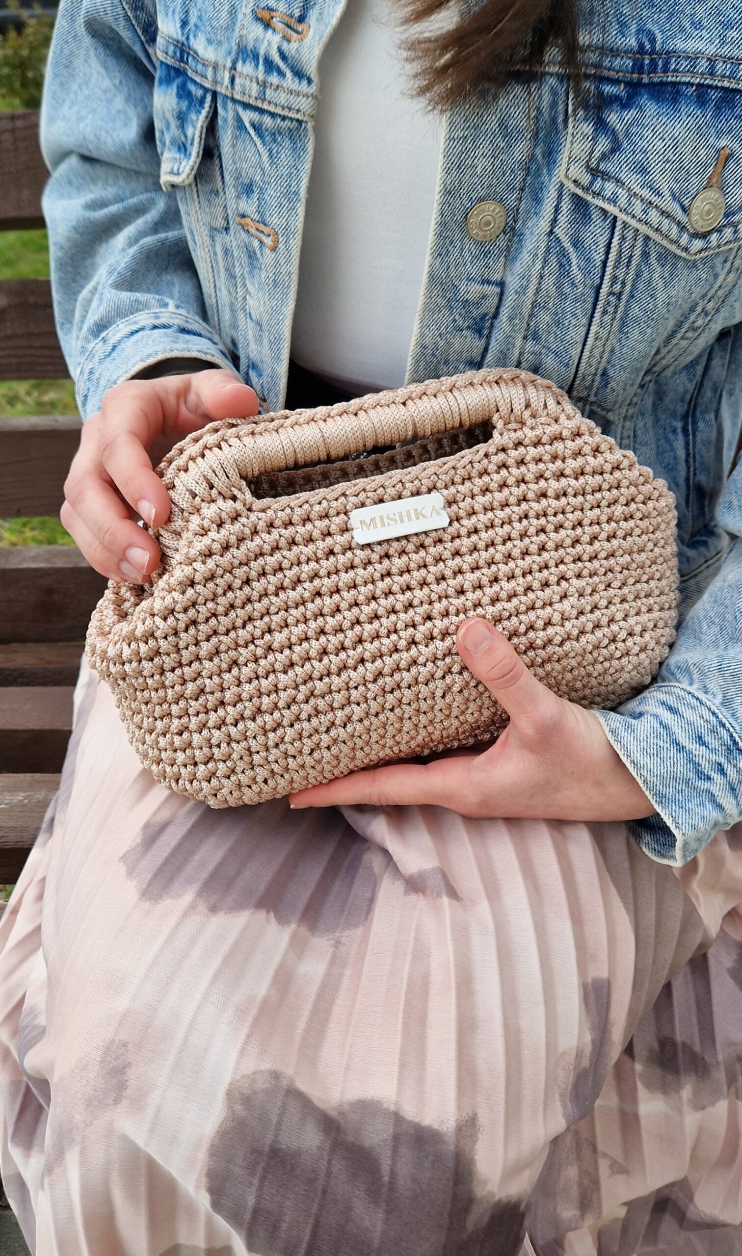 Ručno izrađena torba od macrame konca u bež boji, s prirodnim i teksturiranim izgledom. Dizajnirana je s praktičnom ručkom u sredini, koja omogućava sigurno i udobno držanje.